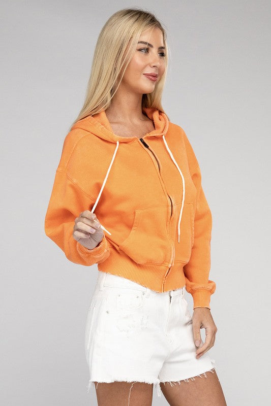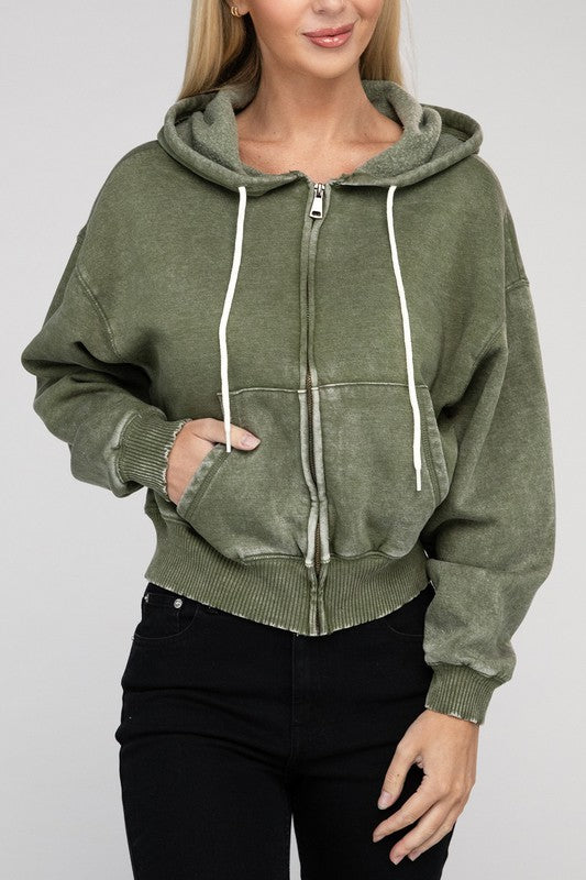 Acid Wash Fleece Cropped Zip-Up Hoodie