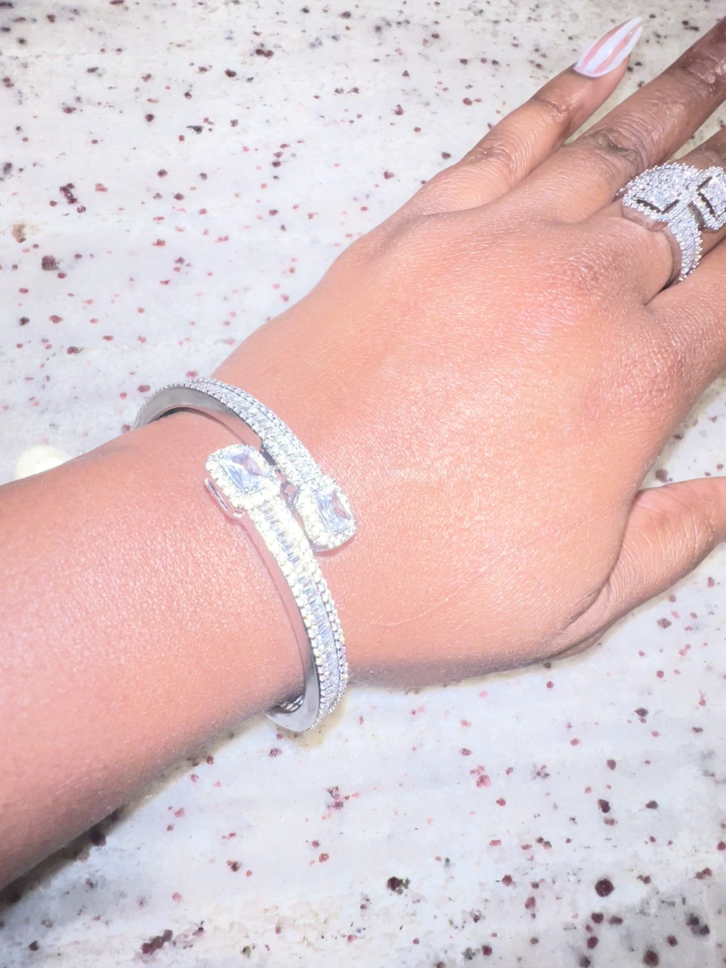 Elevate your style with our Baguette Wrap Bangle and Ring Set! The ring is a size 8 and the bangle is a size 17cm, providing the perfect fit. This luxurious and stunning set will add a touch of elegance to any outfit. Don't miss out!