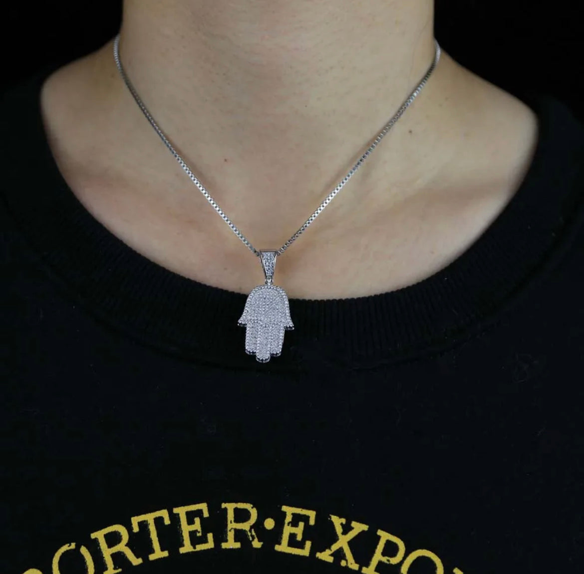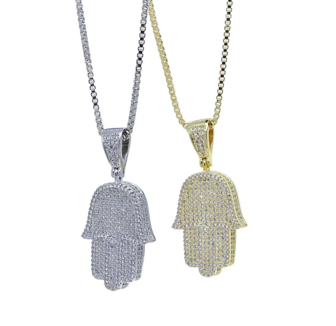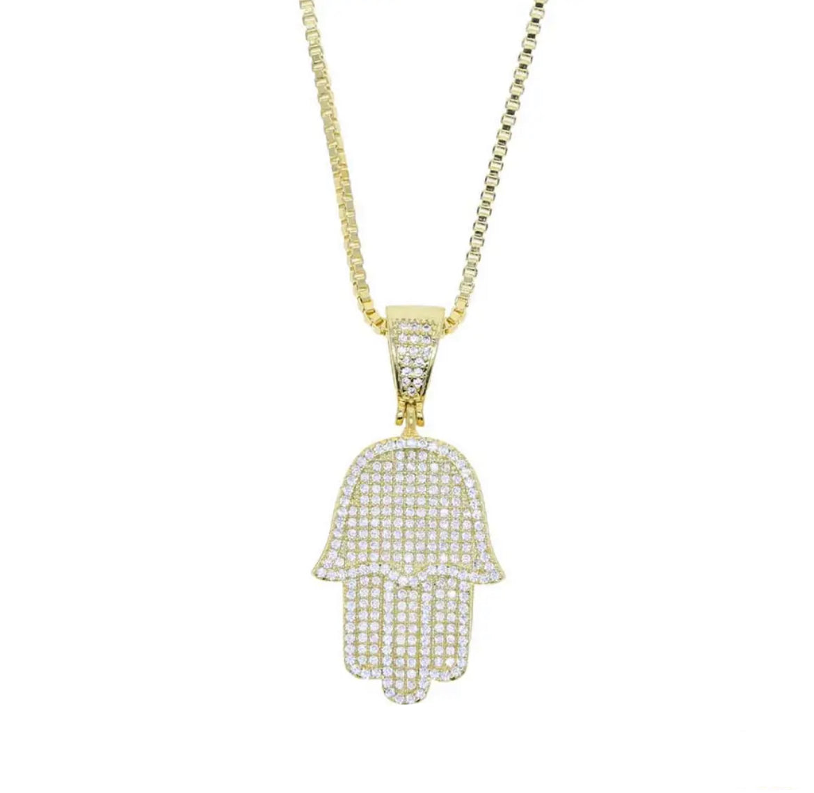 Sparkle and protect with our 3D Pave Hamsa Necklace. This delicate box chain necklace features a stunning pave hamsa charm, bringing positive energy and style to any outfit. A must-have for those who love to make a statement!