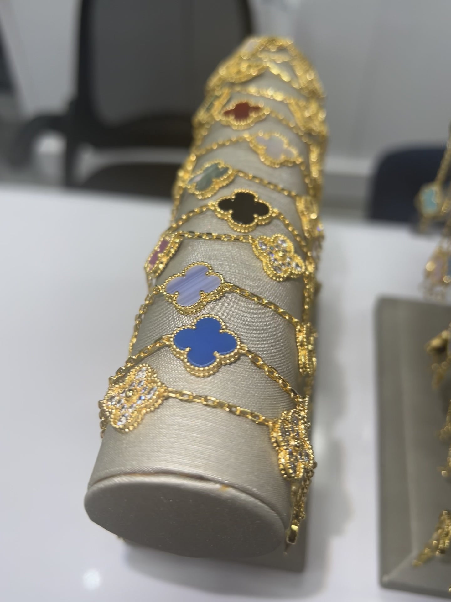 "Bring some extra luck to your outfit with our 5 Clover Bracelet! Made from a variety of precious and semi precious materials, and sparkling crystals, each clover is a symbol of good fortune. Perfect for adding a touch of charm and whimsy to your look. (Luck not guaranteed) 😜"
