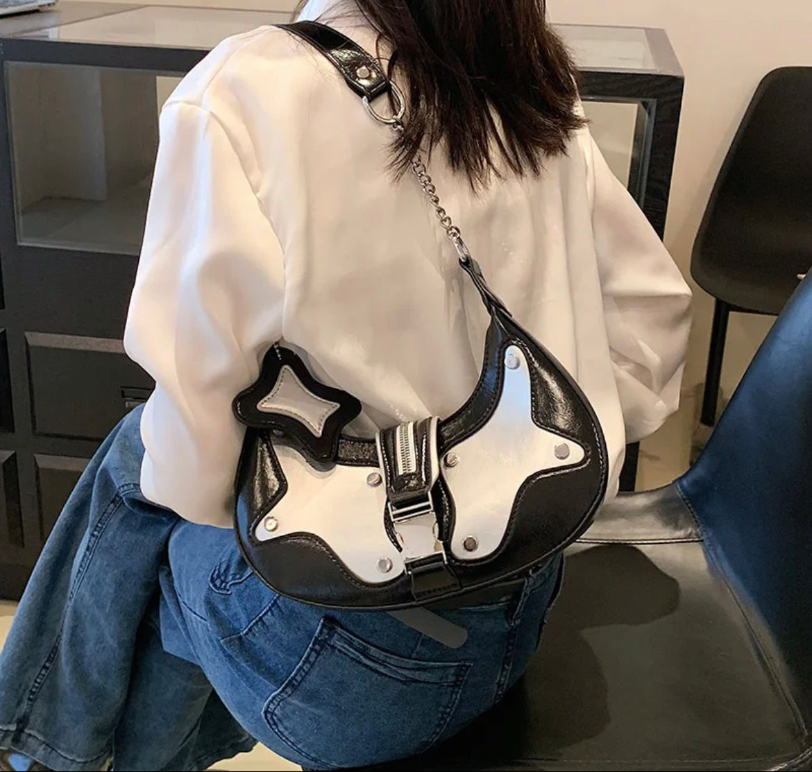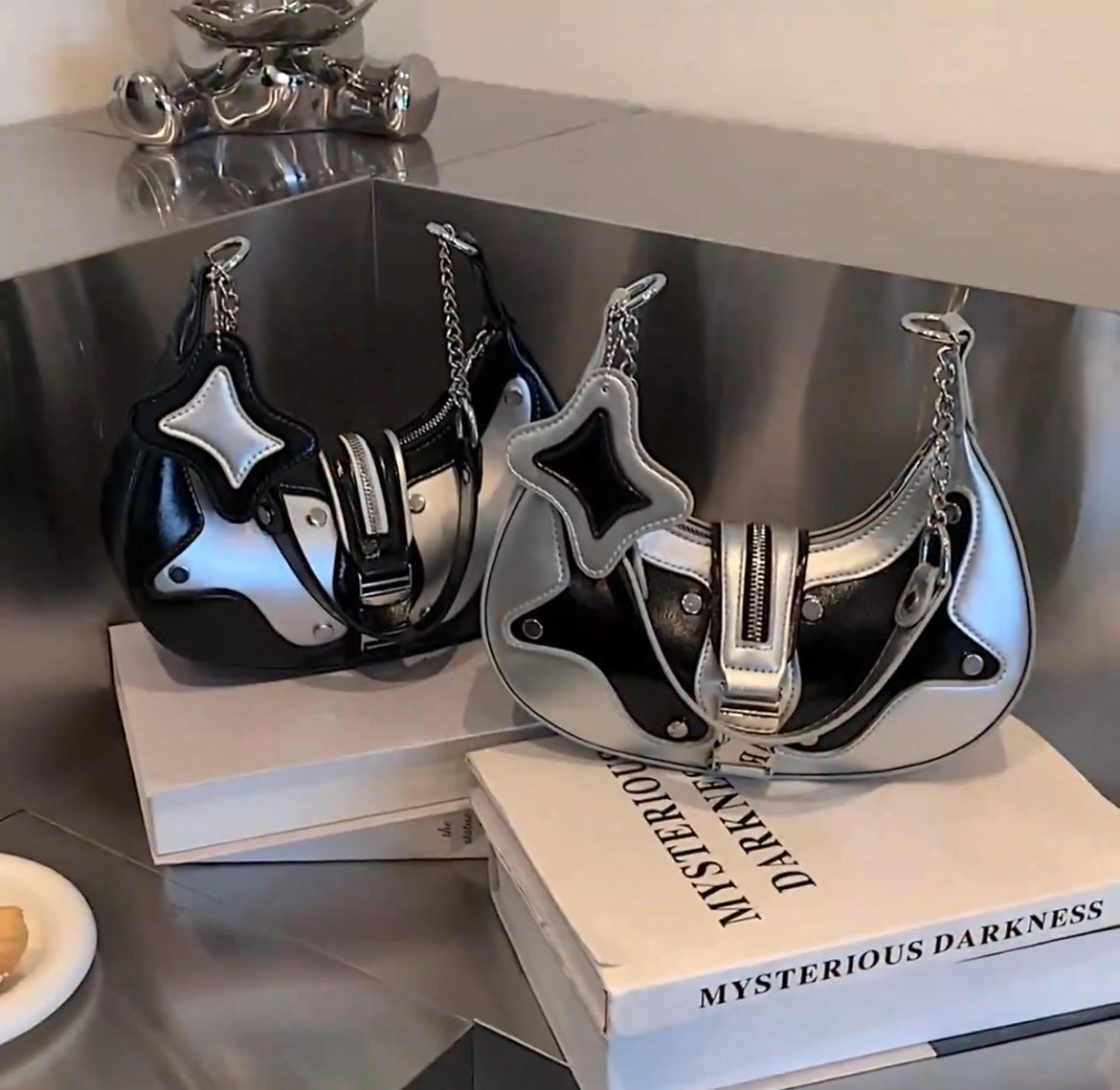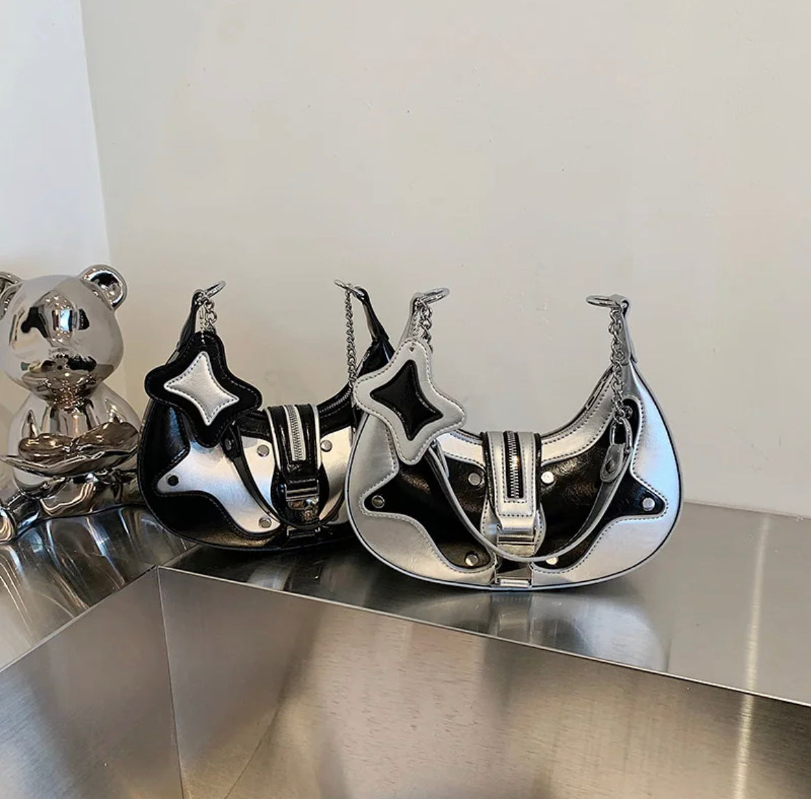 The Rocker Shoulder Bag is the perfect accessory for those who want to add some edgy style to their wardrobe. With its black and silver color scheme and chain shoulder strap, you'll feel like a true rockstar. Plus, the attached key chain adds convenience and functionality. Elevate your look with this must-have bag!