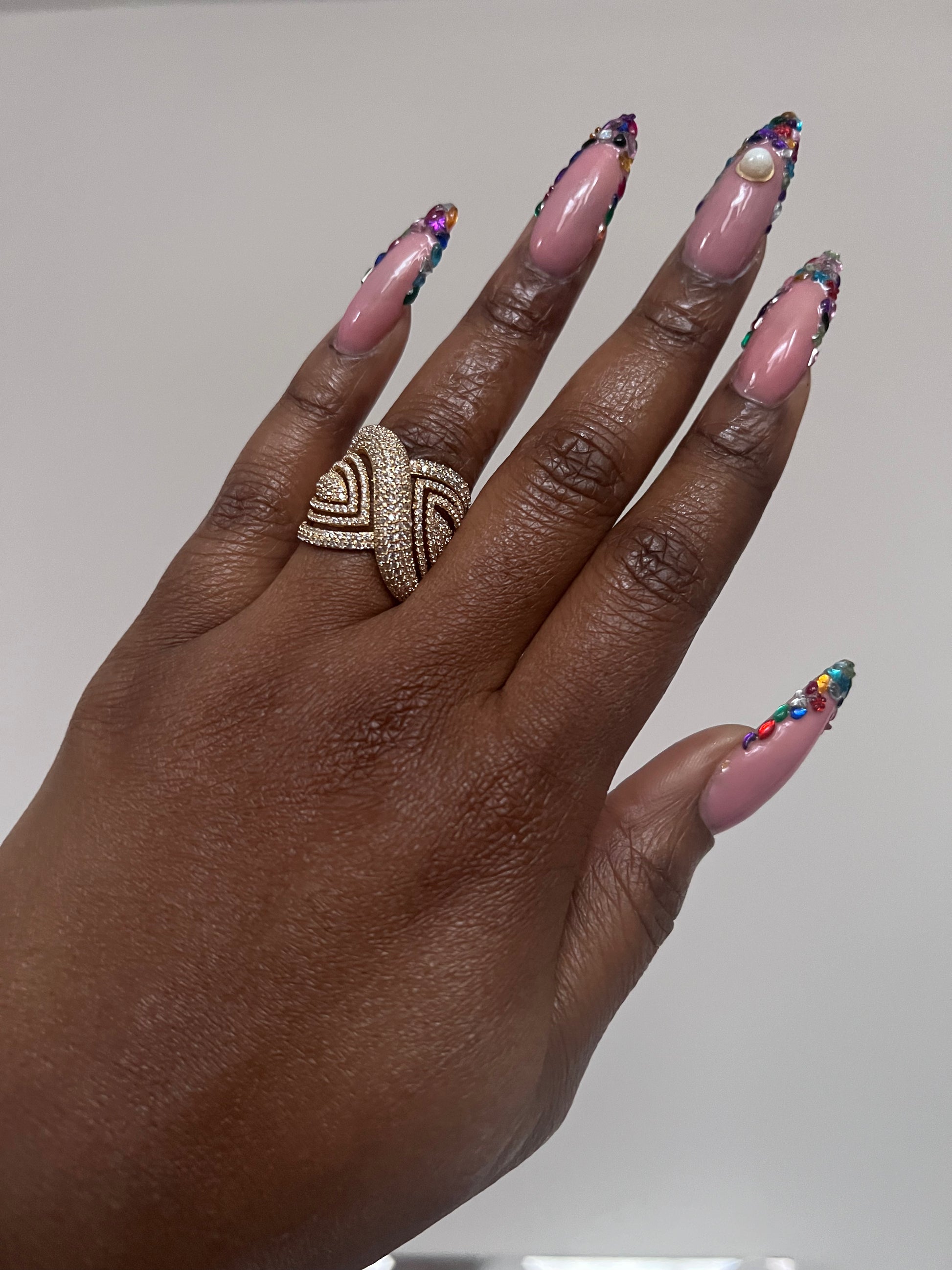Our Womens Lux Pave Cocktail Ring is the statement piece you need for any party or holiday event. This stunning finger accessory showcases dazzling Pave crystals on a 14k gold plated band, adding a touch of luxury to every outfit. Elevate your style and capture attention with this must-have item.!